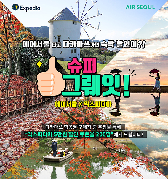 에어서울(대표 류광희)이 다카마쓰(가가와현) 왕복 항공권을 구매한 사람을 대상으로 추첨을 통해 Expedia(익스피디아) 5만원 할인 쿠폰을 증정하는 ‘슈퍼 그뤠잇!’ 이벤트를 실시한다.