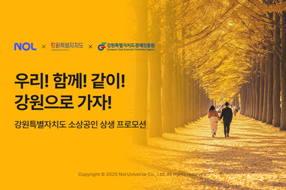 놀유니버스(대표 배보찬)가 운영하는 ‘NOL’은 지난 10월 1일 강원특별자치도와 ‘강원특별자치도 소상공인 상생 협력관’을 10월 한 달간 운영한다고 밝혔다.