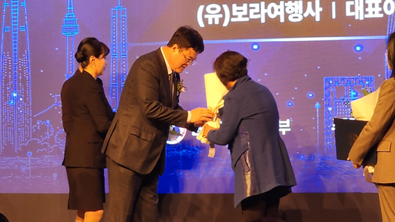 이방실 (유)보라여행사 대표이사(오른쪽)가 제52회 관광의 날 기념식에서 김대현 문화체육관광부 제2차관(왼쪽)으로부터 대통령표창을 수상하고 있다.