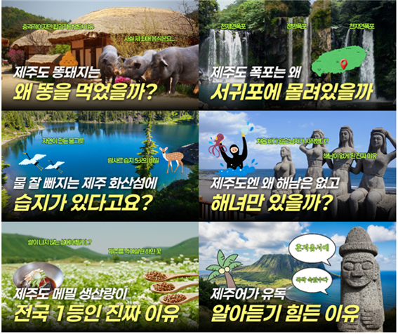 영상은 △똥돼지 : 제주도의 똥돼지는 왜 똥을 먹었을까? △폭포 : 제주도의 폭포는 왜 서귀포에 몰려 있을까? △람사르습지 : 물이 잘 빠지는 제주 화산섬에 습지가 있다고요? △해녀 : 제주도엔 왜 해남은 없고 해녀만 있을까? △메밀 : 제주도 메밀 생산량이 전국 1등인 진짜 이유 △제주어 : 제주어가 알아듣기 힘든 이유? 등 총 6개 주제로 구성됐다.