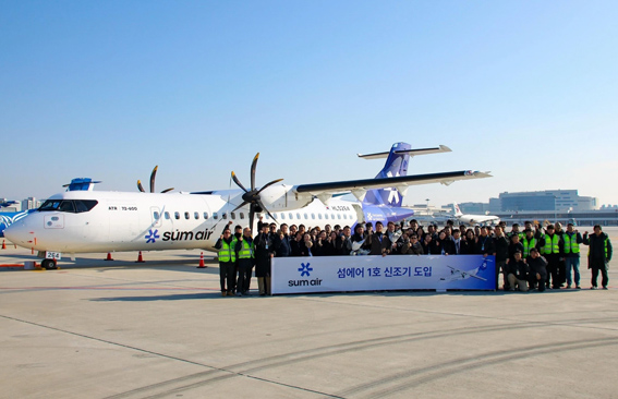 김포공항에 도착한 섬에어 1호기 앞에서 섬에어 전 직원이 기념 촬영을 하고 있다.(ⓒ섬에어).