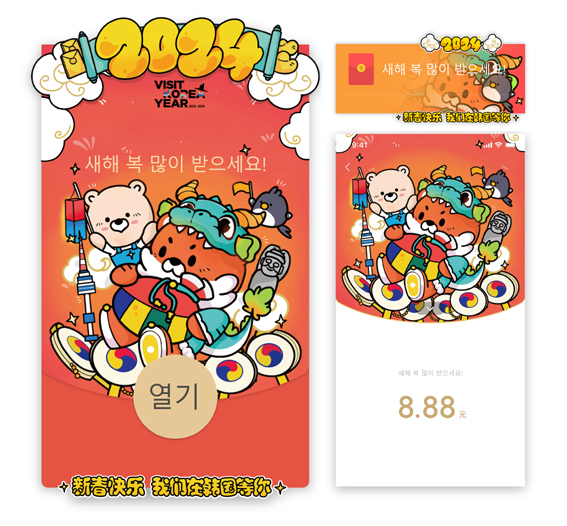 뿐만 아니라 한국관광공사는 ‘디지털 홍바오(세뱃돈이나 축의금 등을 담는 붉은색 봉투나 주머니) SNS 이벤트’도 전개 중이다. 최근 중국 현지에서 위챗(텐센트그룹의 국민 메신저로서 모바일페이 및 쇼핑 등의 부가서비스가 연동됨)으로 홍바오를 주고받는 트렌드를 반영하여, 한국관광공사 7개 중국지사 위챗 계정에서 올해를 상징하는 청룡과 한국관광공사 캐릭터가 그려진 홍바오를 무료로 배포하고 있다.