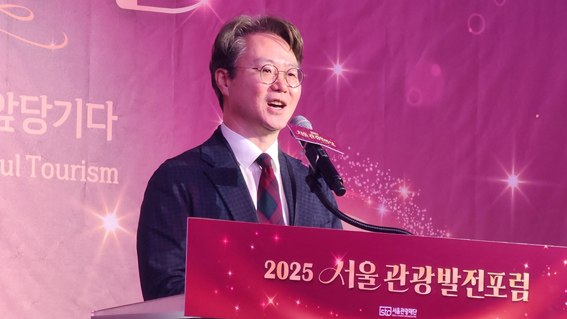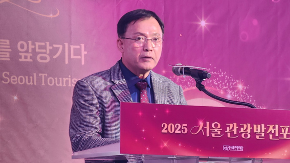 이훈 국회관광산업포럼 민간공동대표(한양대 국제관광대학원 원장)가 2025 서울관광인의 날 서울관광발전 포럼에서 축사를 하고 있다.