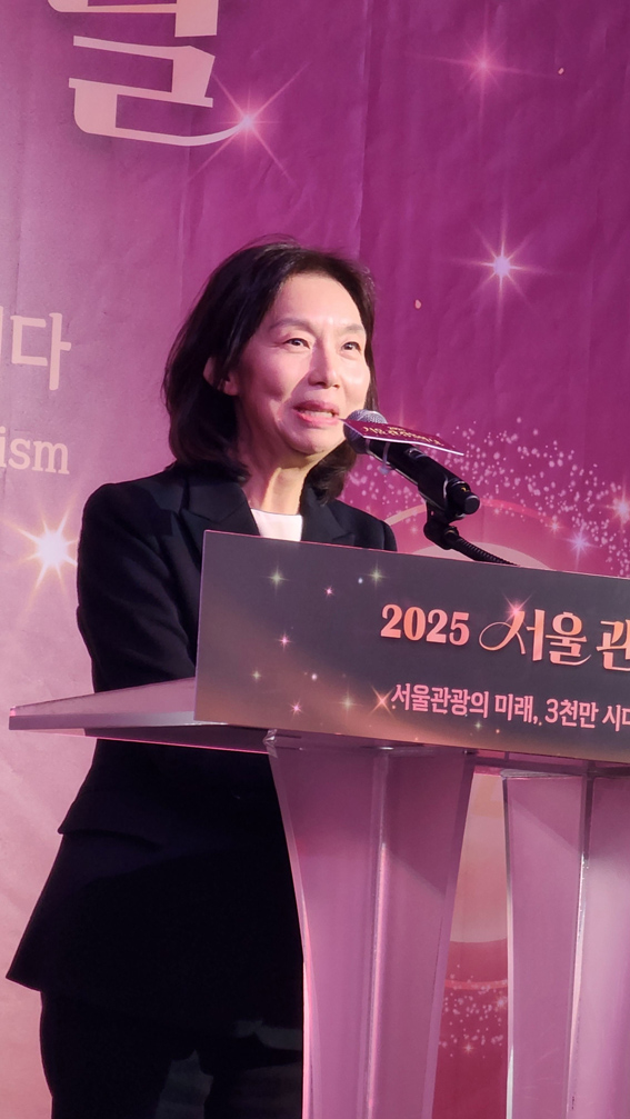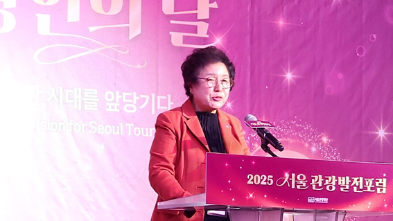 조태숙 서울시관광협회 회장이 2025 서울관광인의 날 서울관광발전 포럼에서 환영사를 하고 있다.