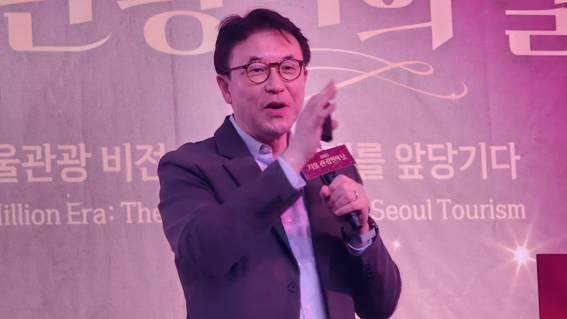박강섭 서울관광재단 이사장이 ‘AI시대 인바운드 활성화를 위한 정책 연계 전략’이란 주제 발표를 하고 있다.