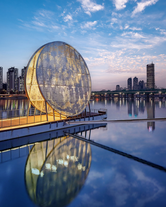 서울에 바다가 있다면?...정말 좋겠지만, 바다로 이어지는 넓은 한강에는 ‘달빛노들’이 언제나 빛을 밝히고 있다. 거대한 보름달을 형상화한 이 조형물은 강물과 도심 풍경을 함께 비추며 흐린 날에도, 맑은 날에도 달을 즐길 수 있게 해준다.