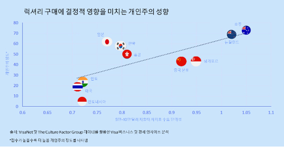 소득은 럭셔리 소비의 주요 동인이지만, 문화 역시 럭셔리 소비 성향을 결정하는 주요 요소인 것으로 나타났다. 비자는 글로벌 비즈니스 컨설팅 및 트레이닝 기업인 ‘더 컬처 팩터 그룹(The Culture Factor Group)’의 데이터를 활용해, 소득 증가분을 럭셔리 소비에 추가로 지출하려는 성향을 사회의 개인주의적 성향 및 집단주의적 성향 지표와 비교 분석했다.