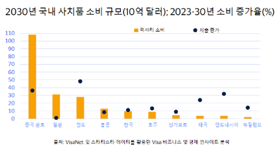 비자의 분석에 따르면, 오는 2030년에는 중국과 일본이 아태지역 전체 럭셔리 소비의 약 65%를 차지하며 시장을 주도할 전망이다. 중국은 1,080억 달러(약 145조 6,000억 원) 규모로 아시아 최대 럭셔리 시장을 형성하고, 일본은 310억 달러(약 41조 8,000억 원) 규모로 2위를 차지할 것으로 예상된다. 한국은 100억 달러(약 13조 5,000억 원) 규모로, 인도(280억 달러)와 홍콩(130억 달러)에 이어서 아시아 5대 럭셔리 시장에 진입할 것으로 분석됐다.