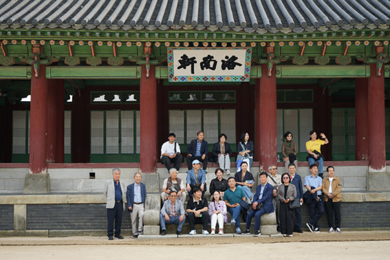 화성행궁 중 유일하게 보전돼 온 낙남헌 앞에서 국제관광인포럼 팸투어 참가자들이 단체 기념사진을 촬영하고 있다.