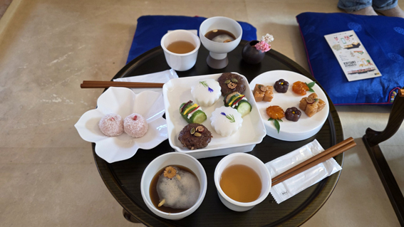 혜경궁 홍씨의 진찬연 음식이 수록되어 있는 ’원행을묘정리의궤‘의 내용을 기반으로 오늘날에도 즐길 수 있도록 구성된 혜경궁 궁중다과상의 모습. 일반 체험단은 1인 1궁중다과로 제공되는데 팸투어 인원상 1상 2인으로 차려졌다.