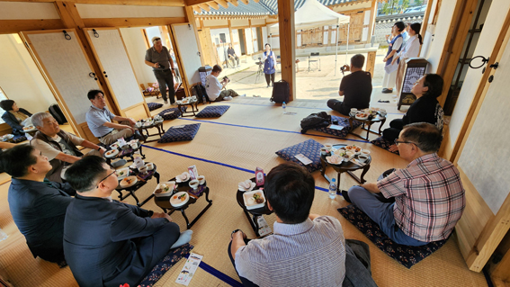 화성행궁 별주에서 혜경궁 홍씨의 궁중다과를 즐기고 있는 국제관광인포럼 회장단의 모습.