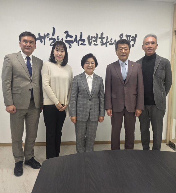 KATA 국제협력위원회는 지난 12월 9일 김미경 은평구청장을 예방하고 따뜻한 겨울나기 성금을 전달했다. (사진 오른쪽에서부터 손서태 서태국제여행사 대표이사, 추신강 KATA 국제협력위원회 위원장, 김미경 은평구청장, 한사람 건너 최성무 아트코리아 대표이사).