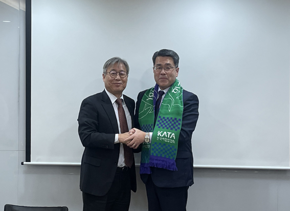 이진석 한국여행업협회 회장(왼쪽)과 후지시로 요시노리 후쿠시마현 관광교류국장(오른쪽)이 지난 2월 12일 KATA에서 간담회를 개최하고, 청주–후쿠시마 간 전세기 취항과 양국 관광 교류 확대 방안을 논의하고 기념사진을 촬영하고 있다.